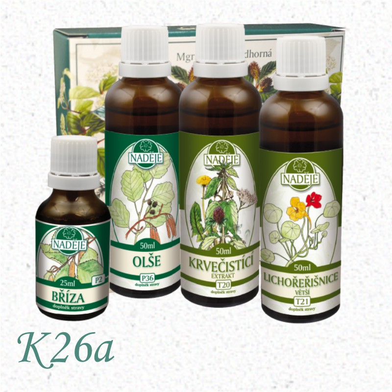 Zloženie kúry K26A: Krvčistiaci extrakt T20, Kapucínka T21, Breza P2, Jelša P36