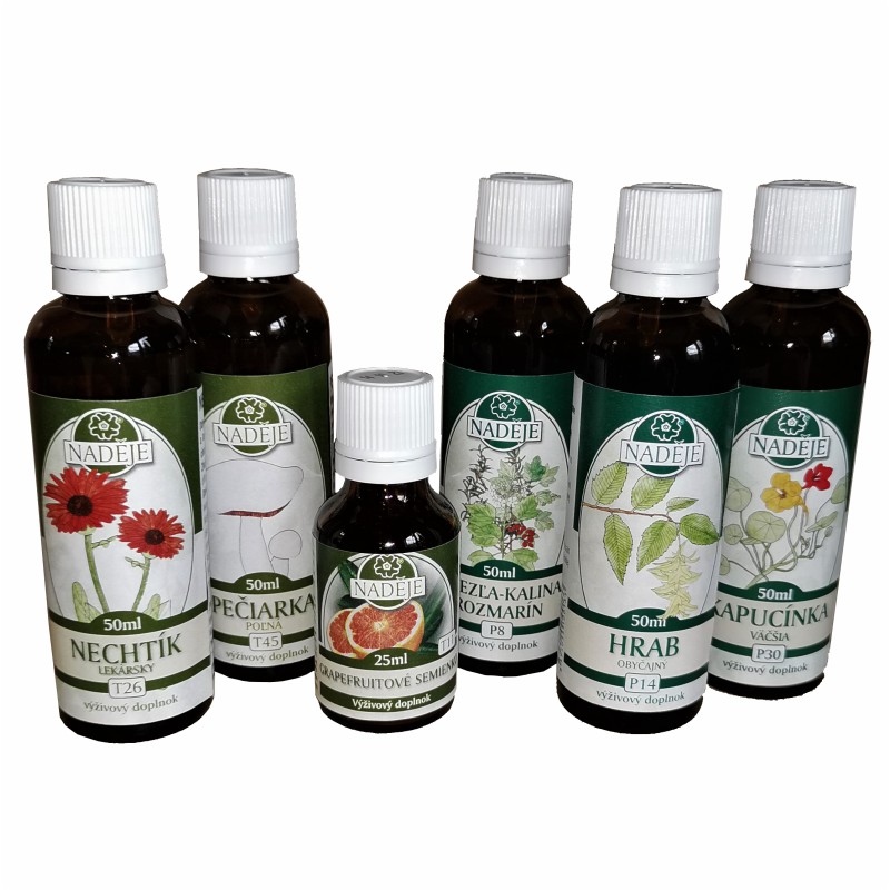 Postup užívania kúry: Začnite užívať nechtík, pečiarku a grep, po využívaní nechtíka a pečiarky pridáte čiernu ríbezľu-kalinu-rozmarín, po využívaní grepu pridáte hrab a nakoniec kapucínku a všetko spolu doužívate.