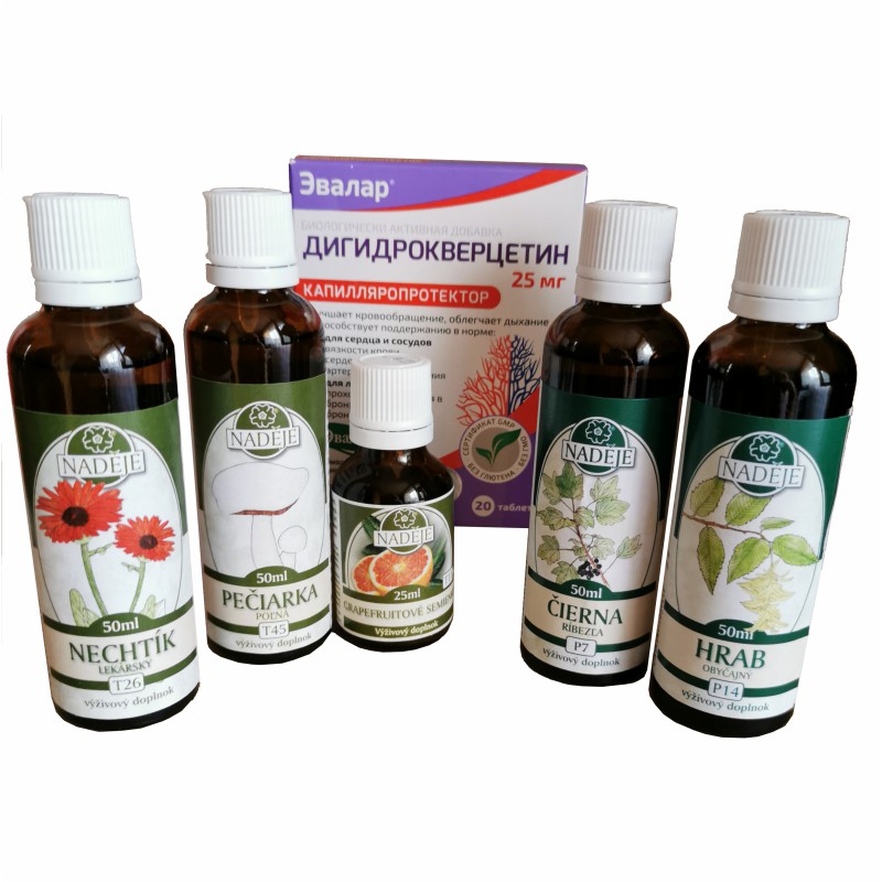 Zloženie kúry: nechtík T26, pečiarka T45, grep T11, čierna ríbezľa P7 a hrab P14, Dihydroquercentin plus 500 mg.