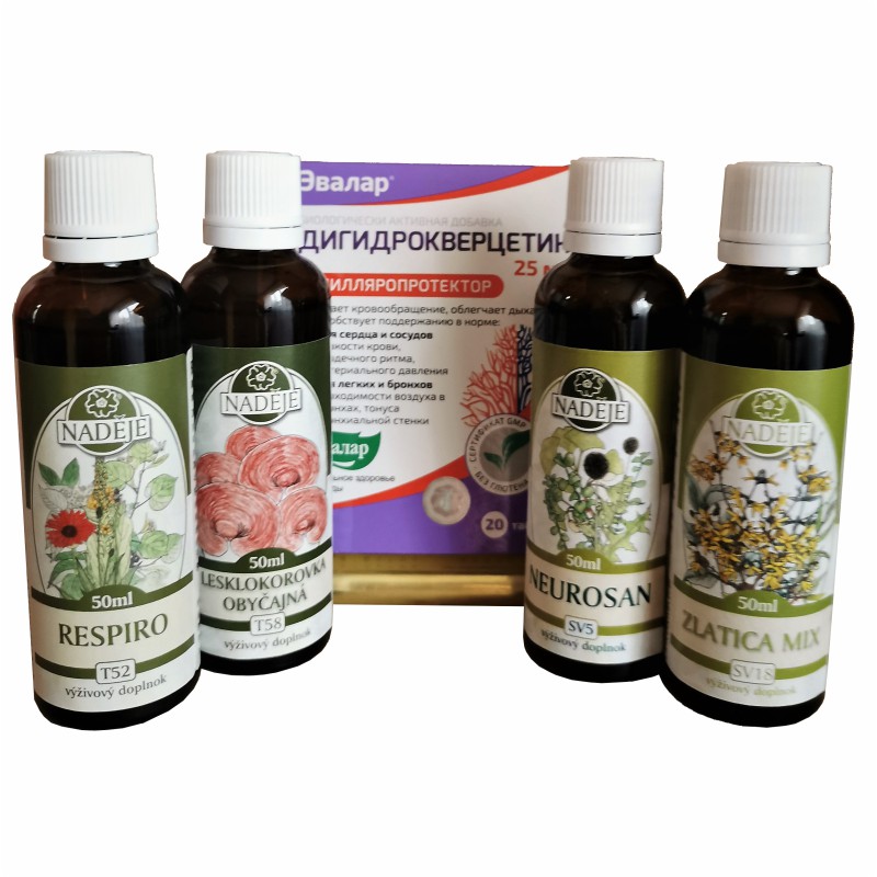 Zloženie kúry: Respiro T52, Leskokôrka T58, Zlatica Mix SV18, Neurosan SV5 a Dihydroquercentin plus 500 mg.