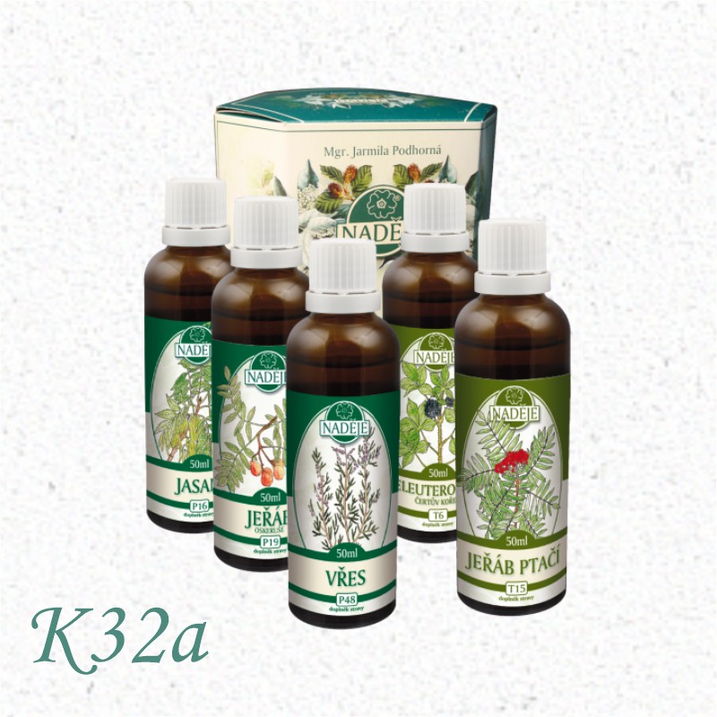 Zloženie kúry K32A: jarabina vtáčia T15, eleuterokok T6, jaseň P16, jarabina oskorušová P19, vres 48