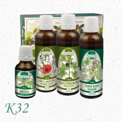 Zloženie kúry K32: vres-nechtík-pichliač T44, eleuterokok T6, breza P2, malina-čierna ríbezľa P10