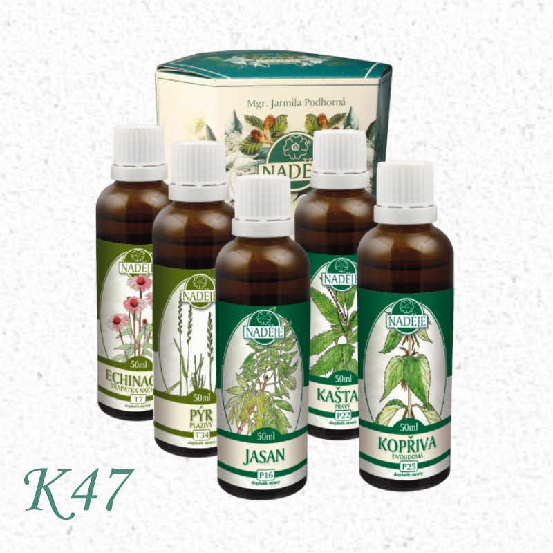 Zloženie kúry K47: Echinacea T7, Pýr T34, Jaseň P16, Gaštan pravý P22, Pŕhľava P25