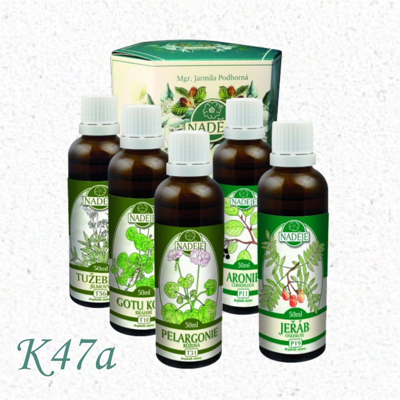 Zloženie kúry K47A: tužobník brestový T56, gotu-gola T10, muškát T31, jarabina oskorušová P19, arónia P11
