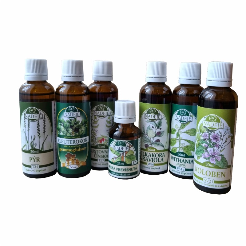 Zloženie kúry: Pýr T34, Eleuterokok s BG TG6, Kustovnica T57, Breza P2, Vilkakora-graviola SV10, Whitania P61 a Koloben SV21.