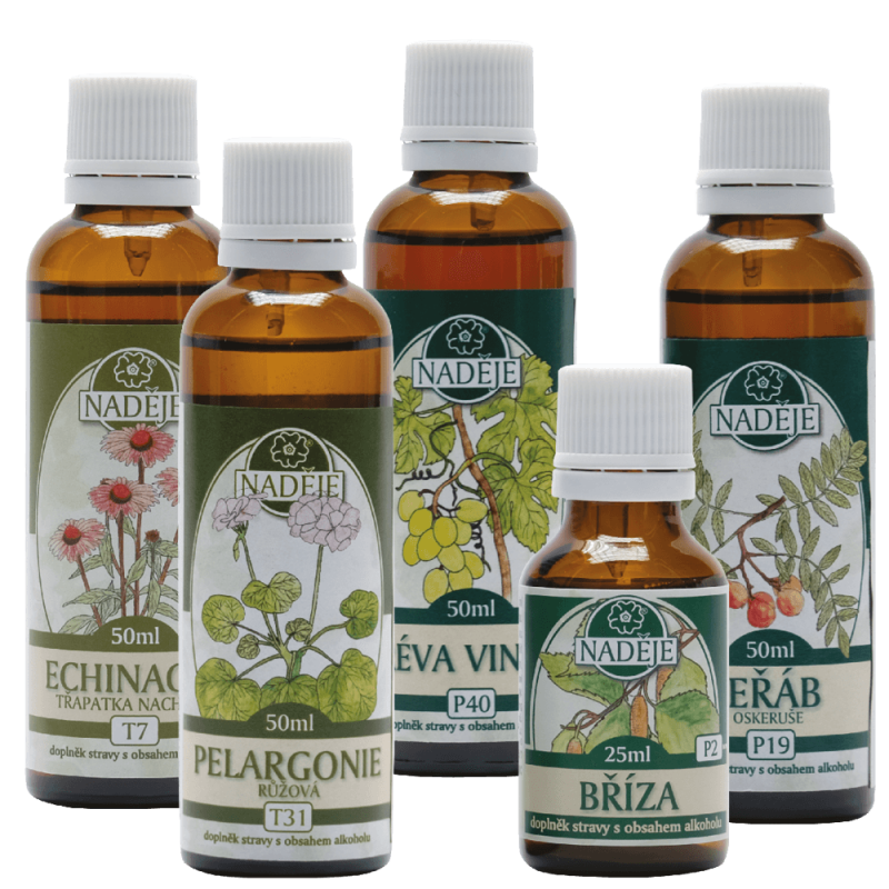 Postup užívania kúry: Súčasne užívať tinktúry echinacea, muškát a breza, po využití tinktúry brezy vezmete vinič a pokračujete v užívaní echinaceou a muškátom, pokiaľ vám dôjdu, tak bez nich. Po využití vínnej révy vezmete nakoniec jarabinu oskorušovú a všetko doužívať.