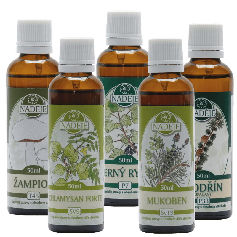 Postup užívania kúry: Súčasne užívať tinktúry šampiňón, Chlamysan a čierne ríbezle, po využití tinktúry čierne ríbezle vezmete Mukoben a pokračujete v užívaní šampiňónu a Chlamysanu, ak vám dôjdu, tak bez nich. Po využití Mukobenu vezmete nakoniec smrekovec a všetko doužívať.