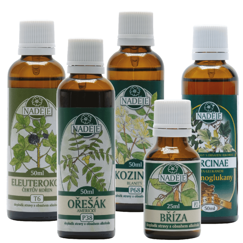 Zloženie kúry: T06 Eleuterokok - Všehojivec štetinatý - Obranyschopnosť, imunitný systém, adaptogén, diabetes. P2 Breza previsnutá - Cholesterol, pečeň, obličky, trávenie, prečisťovanie. P38 Orech čierny - Krvné tuky, cholesterol, črevný trakt, obranné reakcie organizmu. P68 Kozinec blanitý - Obranyschopnosť, povzbudenie organizmu, menštruácia, menopauza. PG59 CARCINAE. Táto zmes je zložená zo zložiek výrazne posilňujúcich obranné systémy organizmu.