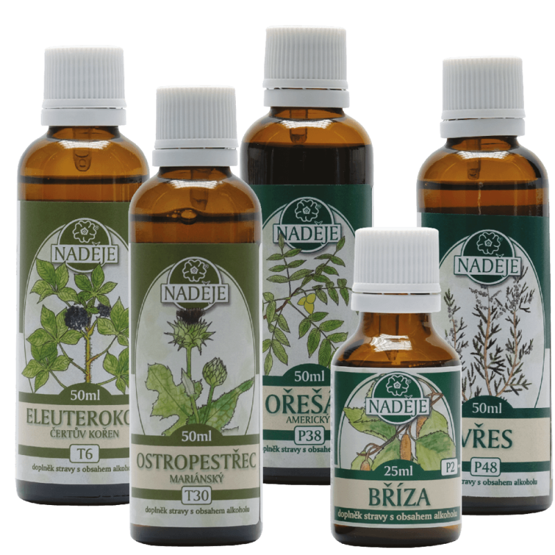 Zloženie kúry: T06 Eleuterokok - Všehojivec štetinatý - Obranyschopnosť, imunitný systém, adaptogén, diabetes. T30 Pestrec mariánsky - Pečeňové funkcie, ochrana tkaniva pečene, detoxikácia, prečisťovanie tela. P2/P2A Breza previsnutá - Cholesterol, pečeň, obličky, trávenie, prečisťovanie. P38 Orech čierny - Krvné tuky, cholesterol, črevný trakt, obranné reakcie organizmu. P48 Vres obyčajný - Obranný systém, upokojenie a uvoľnenie, psychické vypätie, vyčerpanosť.